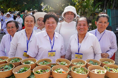 | Các cô chú Họ đạo Sài Gòn liên quận 5, quận 8 đã chuẩn bị hơn 500 phần phở chay và 200 phần bánh mì cùng hàng trăm kí trái cây mang đến phiên chợ. |